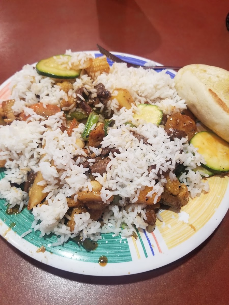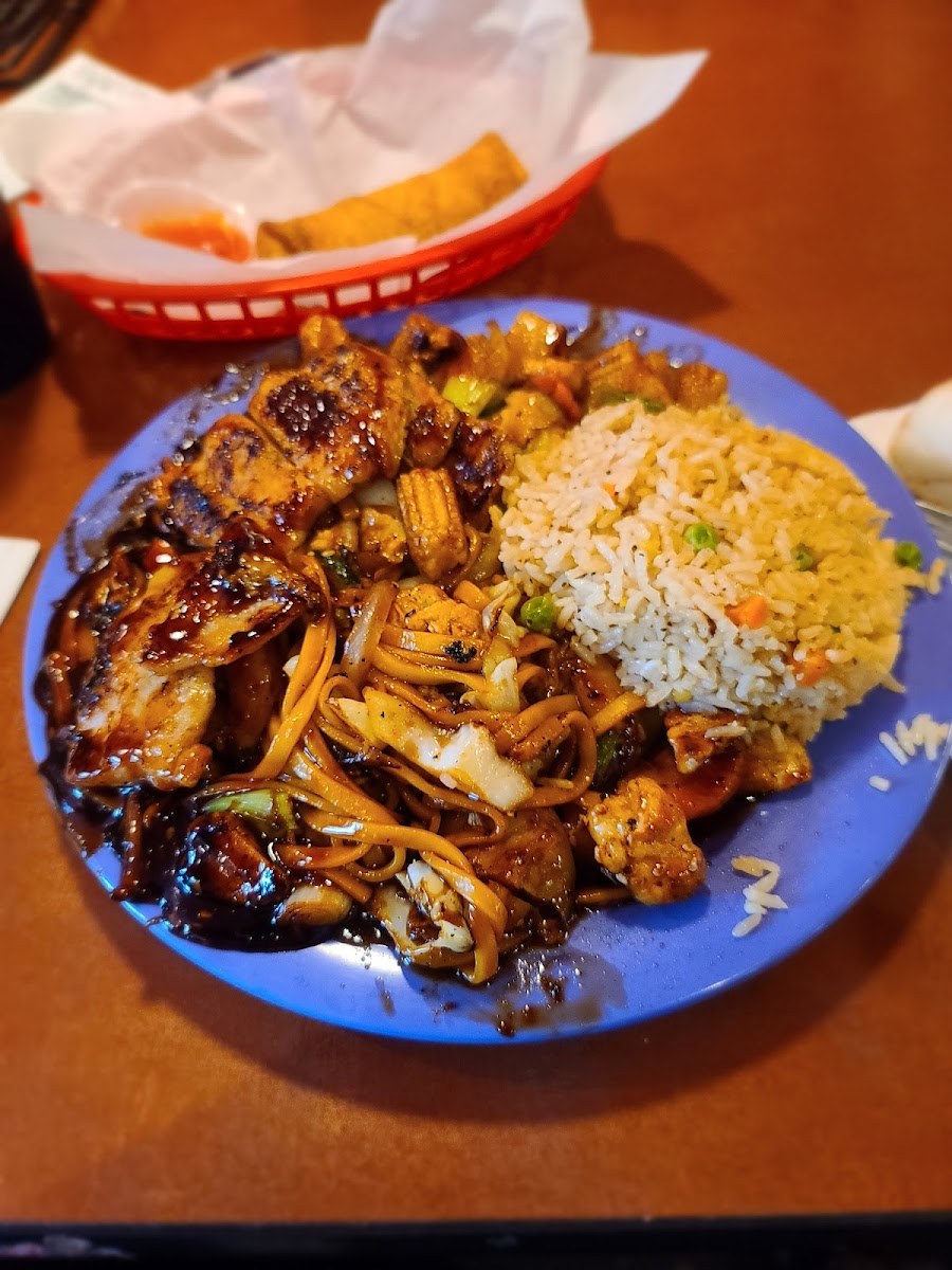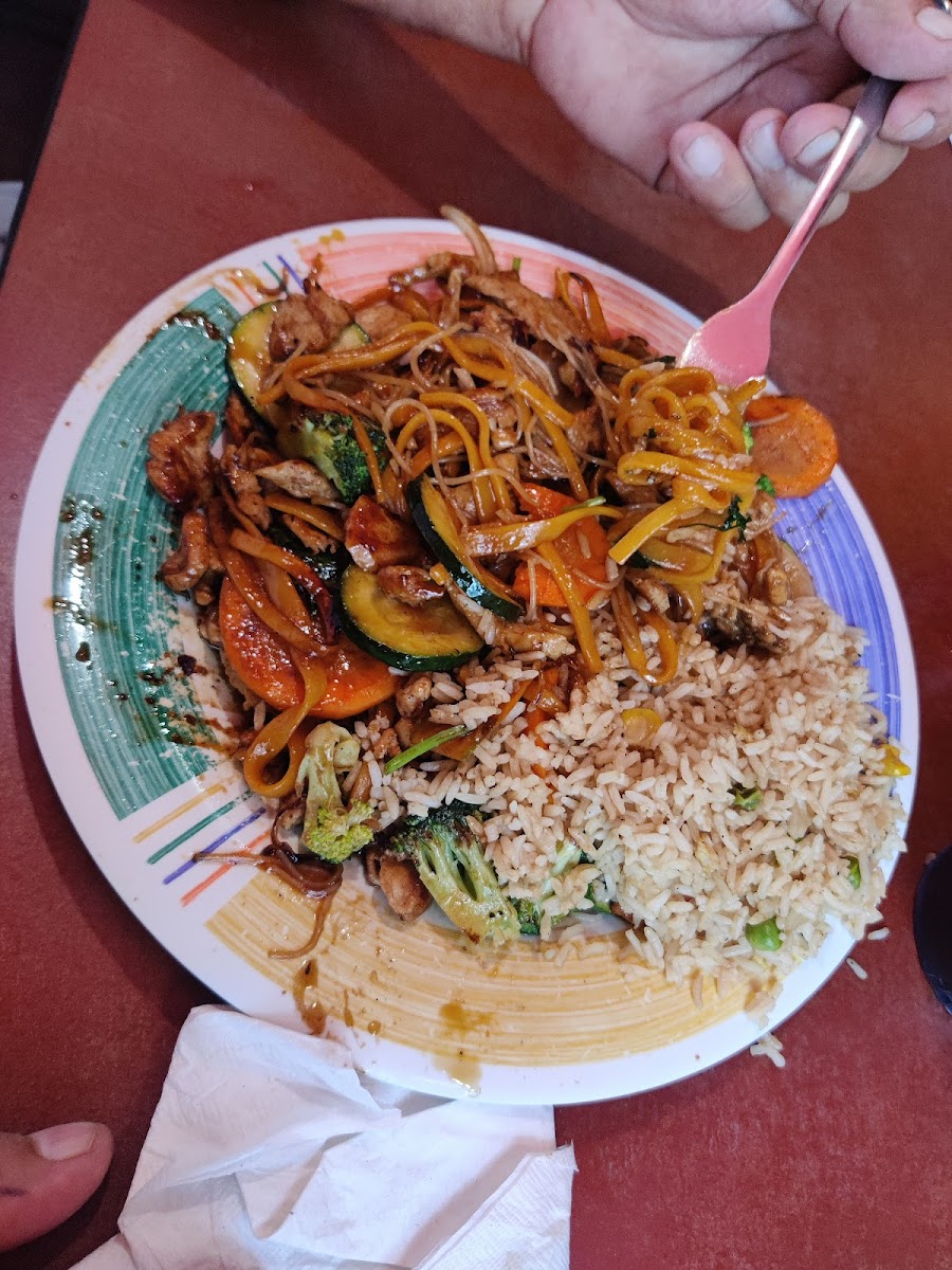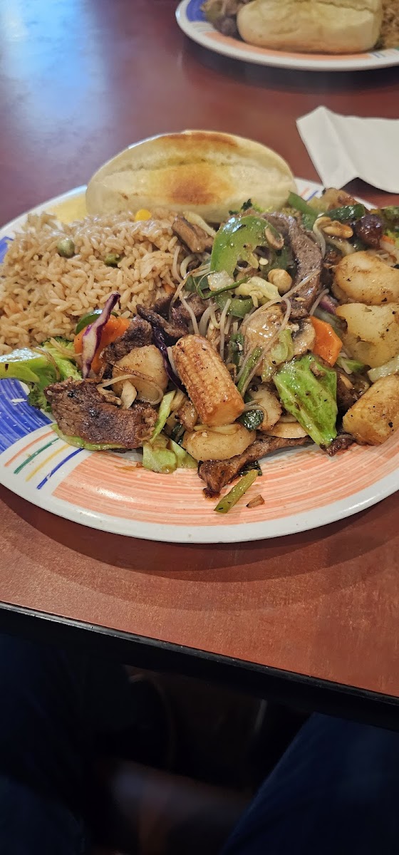 Good for the price, 2 adults with sodas and 1 kid menu $45.09. The concept is different, you have a bowl with all the veggies that fit inside: noodles, pasta, onion, green onion, mushrooms, zucchini, broccoli, bell peppers, … For the protein, you have a smaller bowl: beef, pork, chicken, tofu, salmon, … You also need to choose a sauce. Everything is cooked on a central hot grill. They give you also as a side rice or fried rice and a bread. The waitresses are fast and the cooks are friendly!